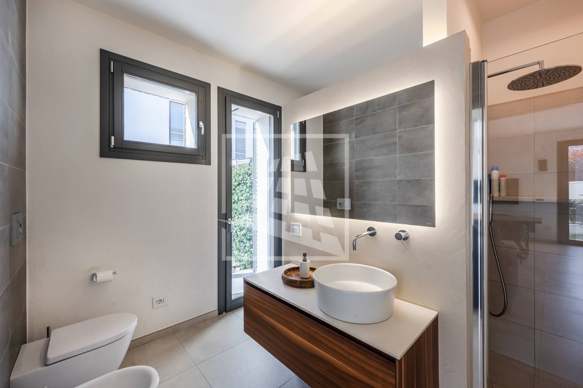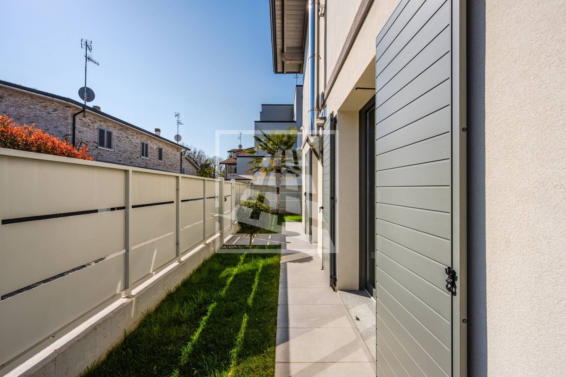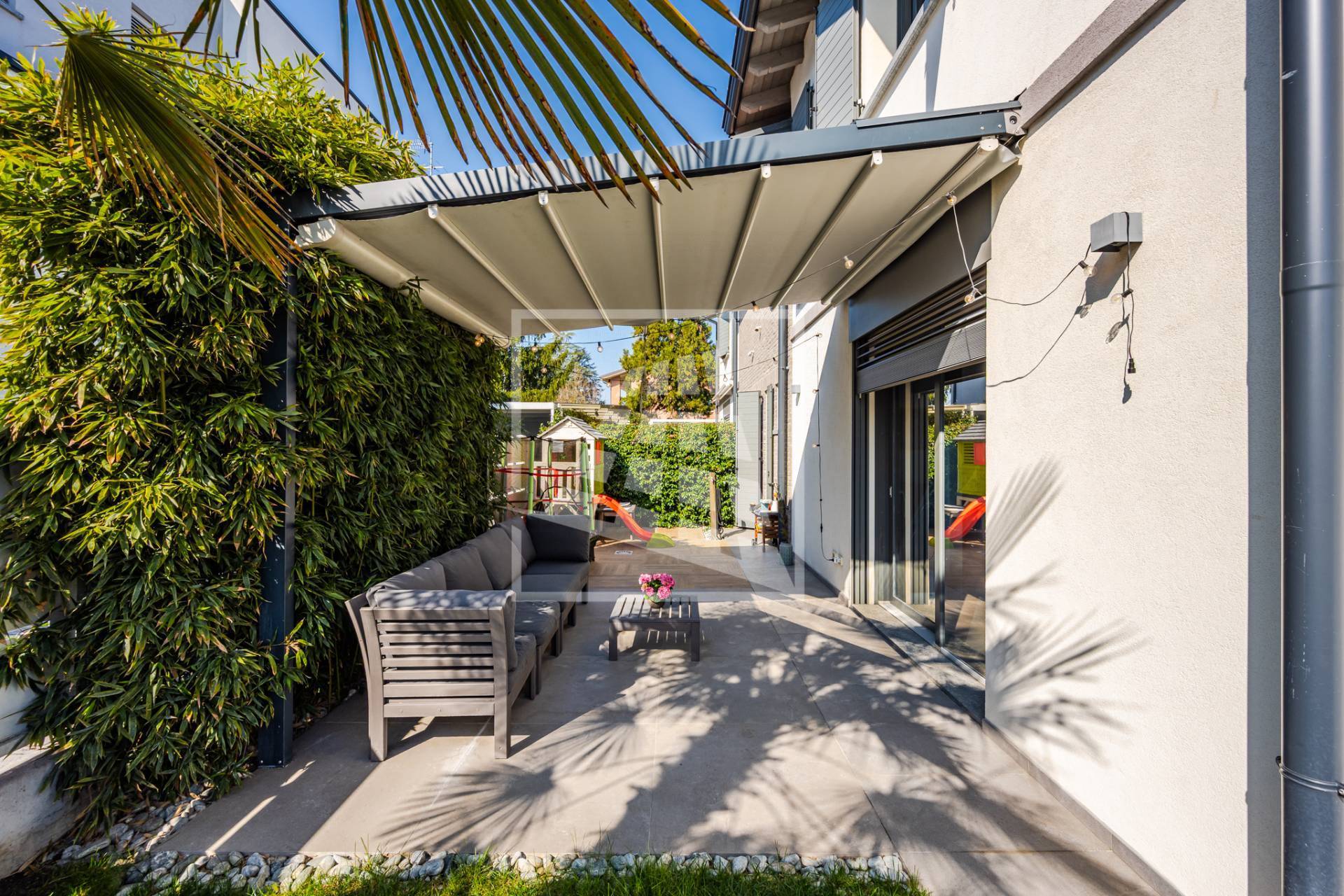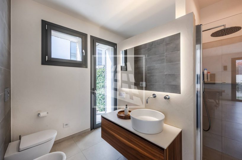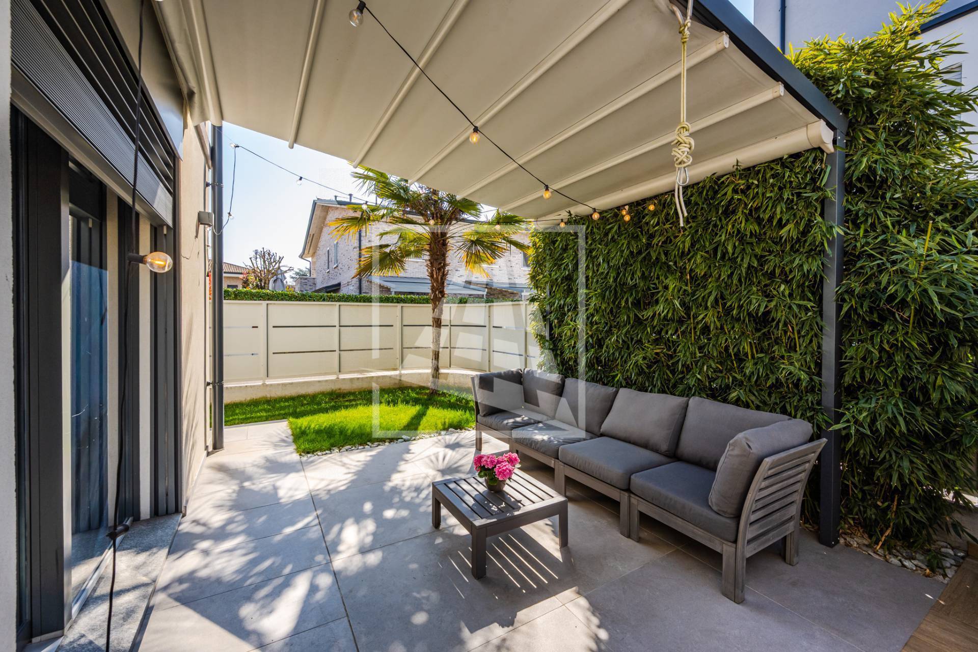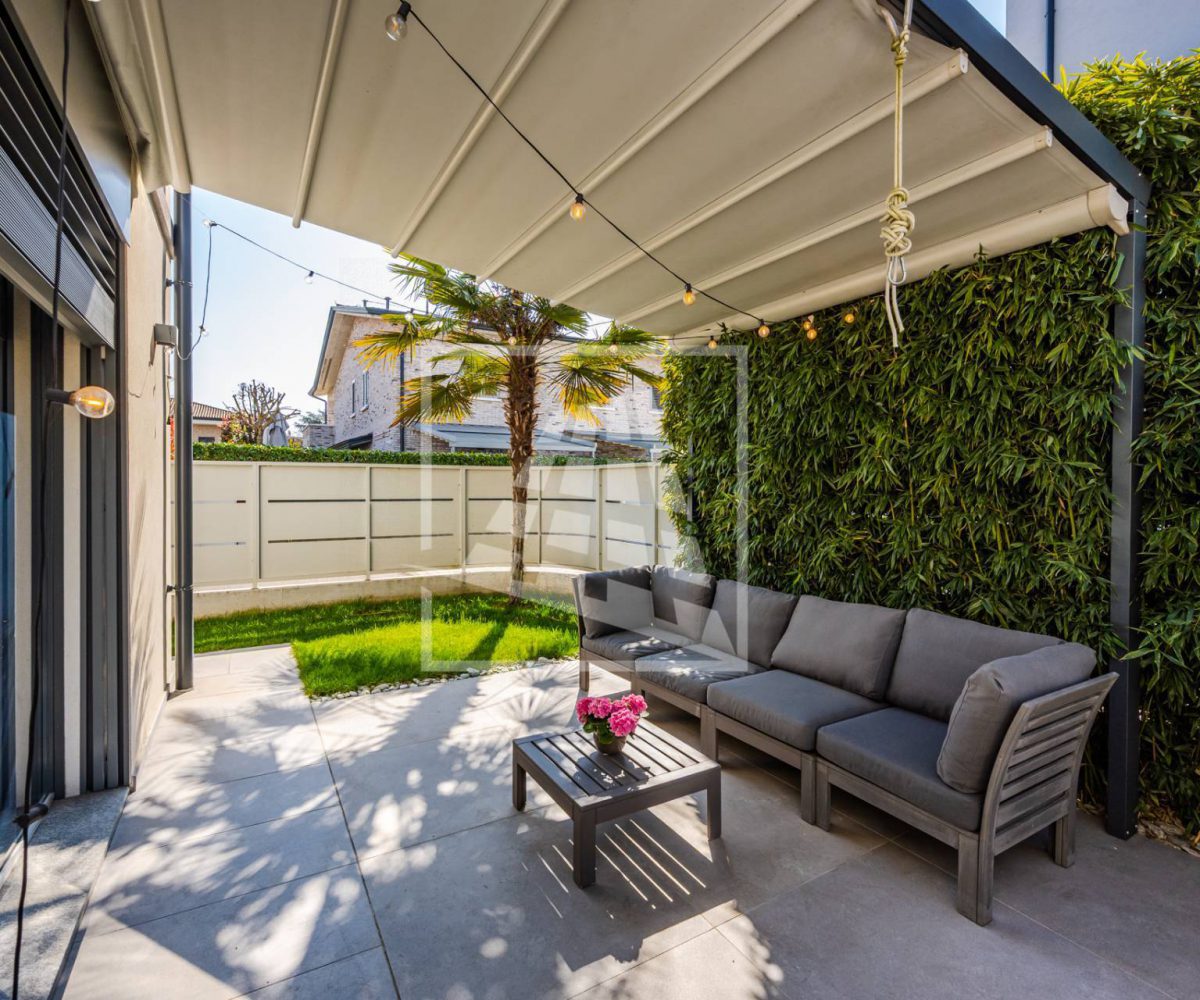 Da questa zona si accede direttamente al giardino privato dotato di illuminazione, in parte pavimentato e valorizzato da una comoda pergotenda elettrica, ideale per pranzare all’aperto e godere della massima privacy.
