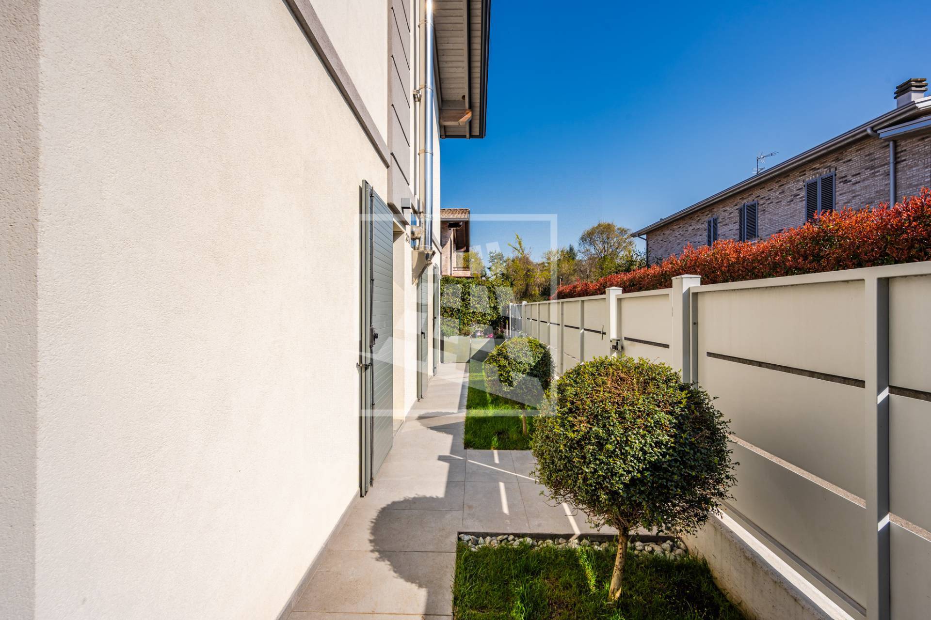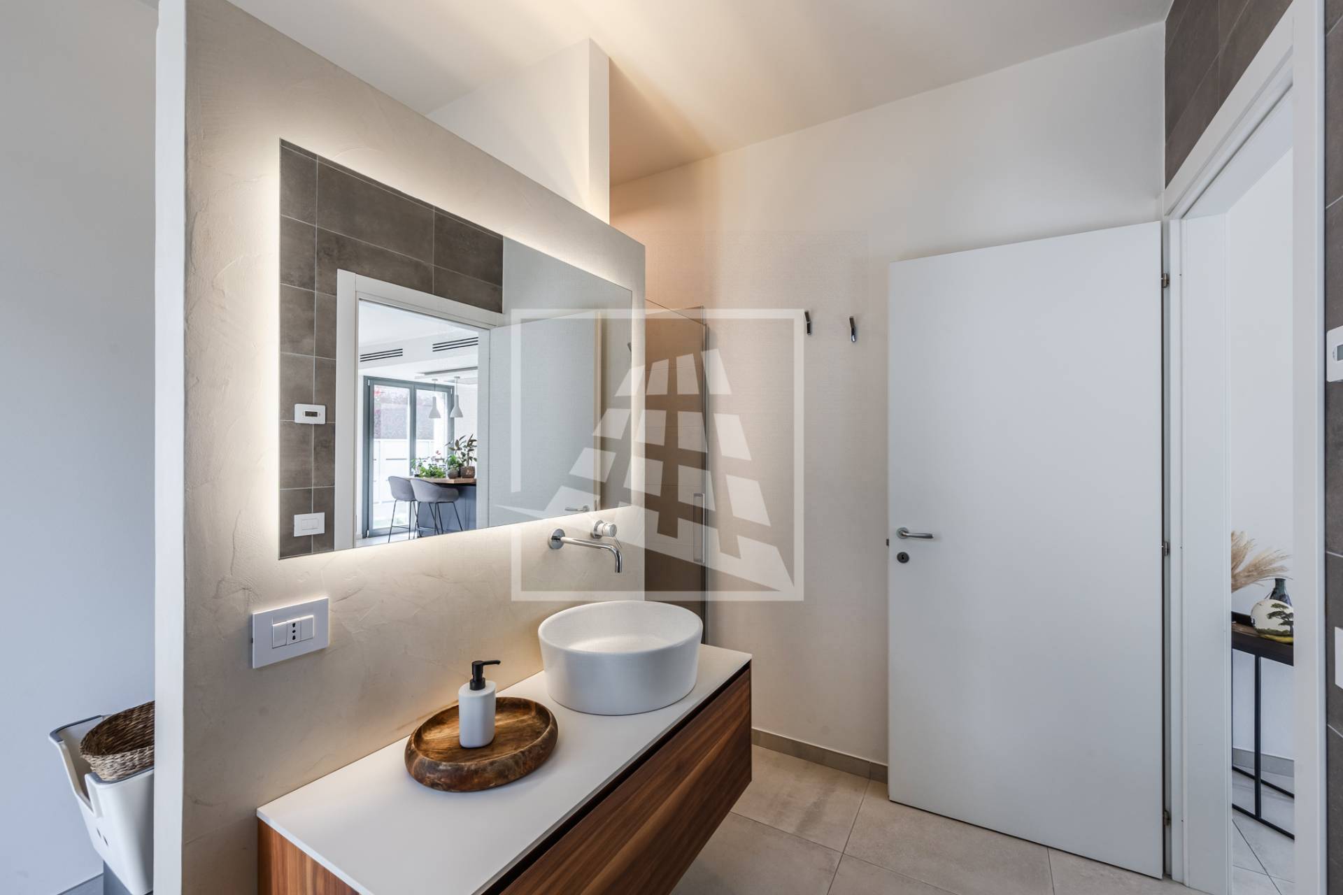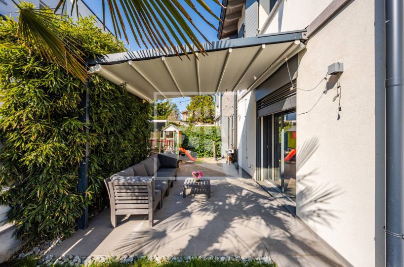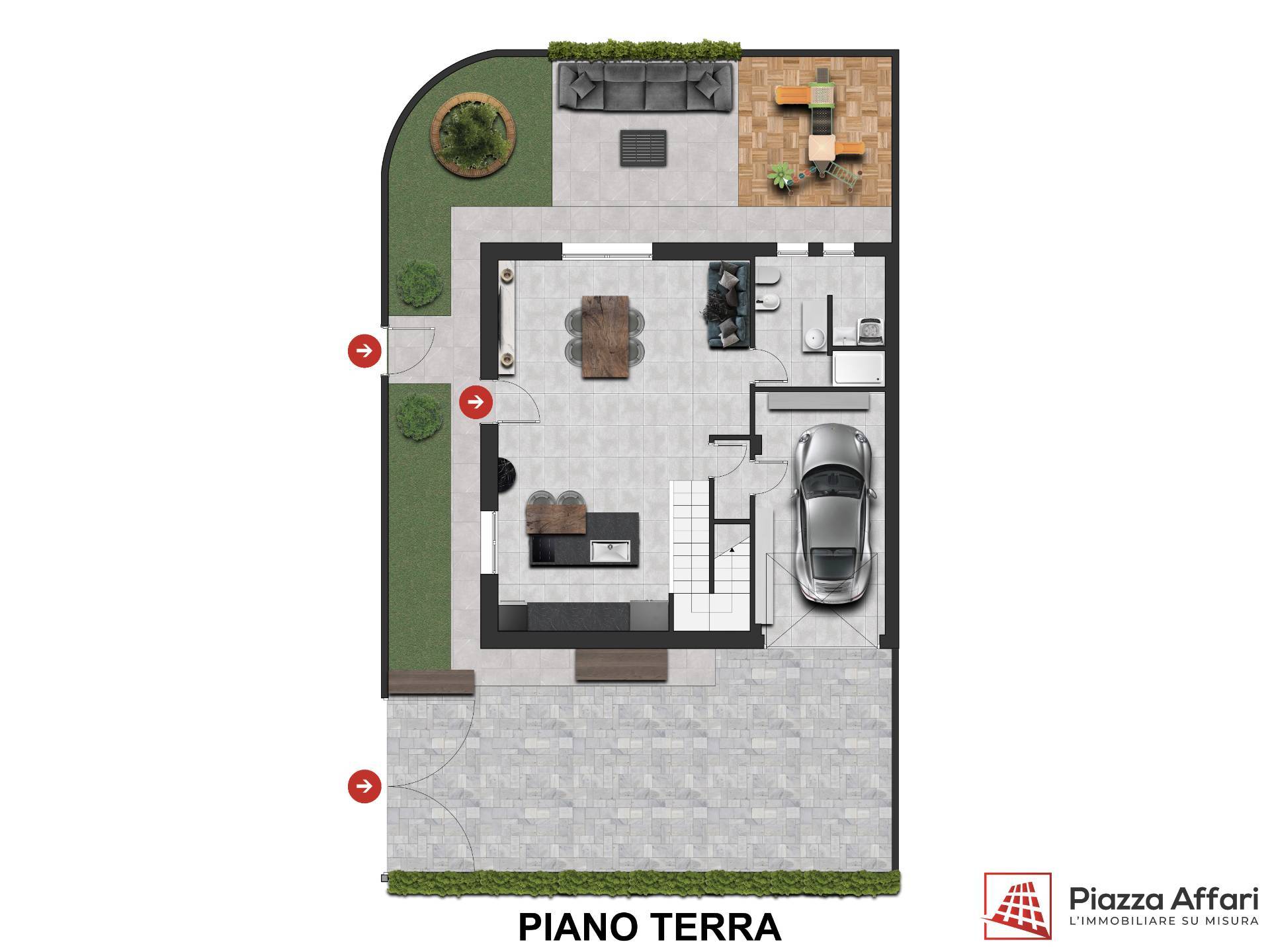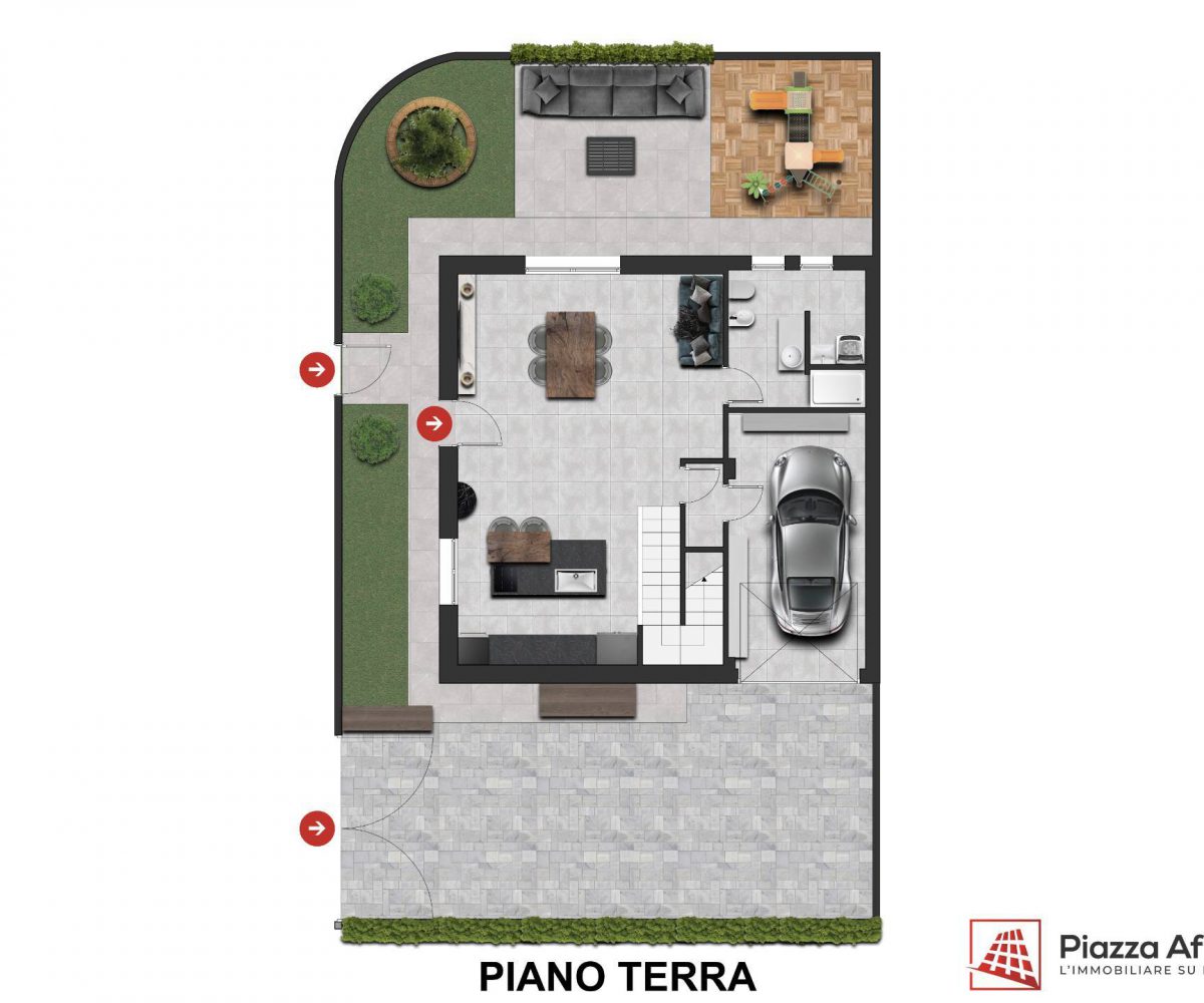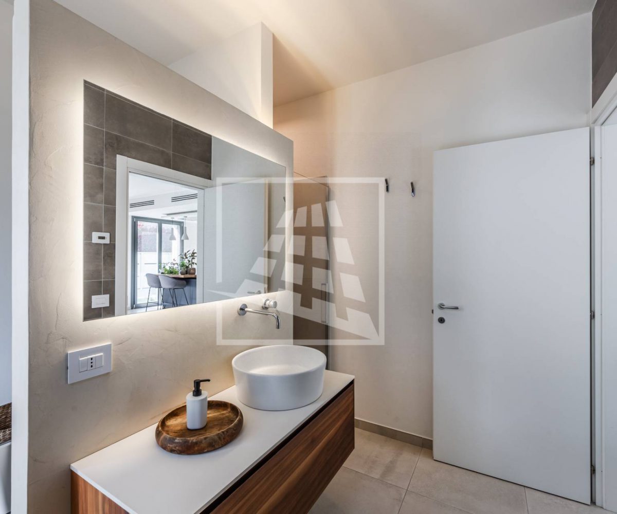 Da questa zona si accede direttamente al giardino privato dotato di illuminazione, in parte pavimentato e valorizzato da una comoda pergotenda elettrica, ideale per pranzare all’aperto e godere della massima privacy.