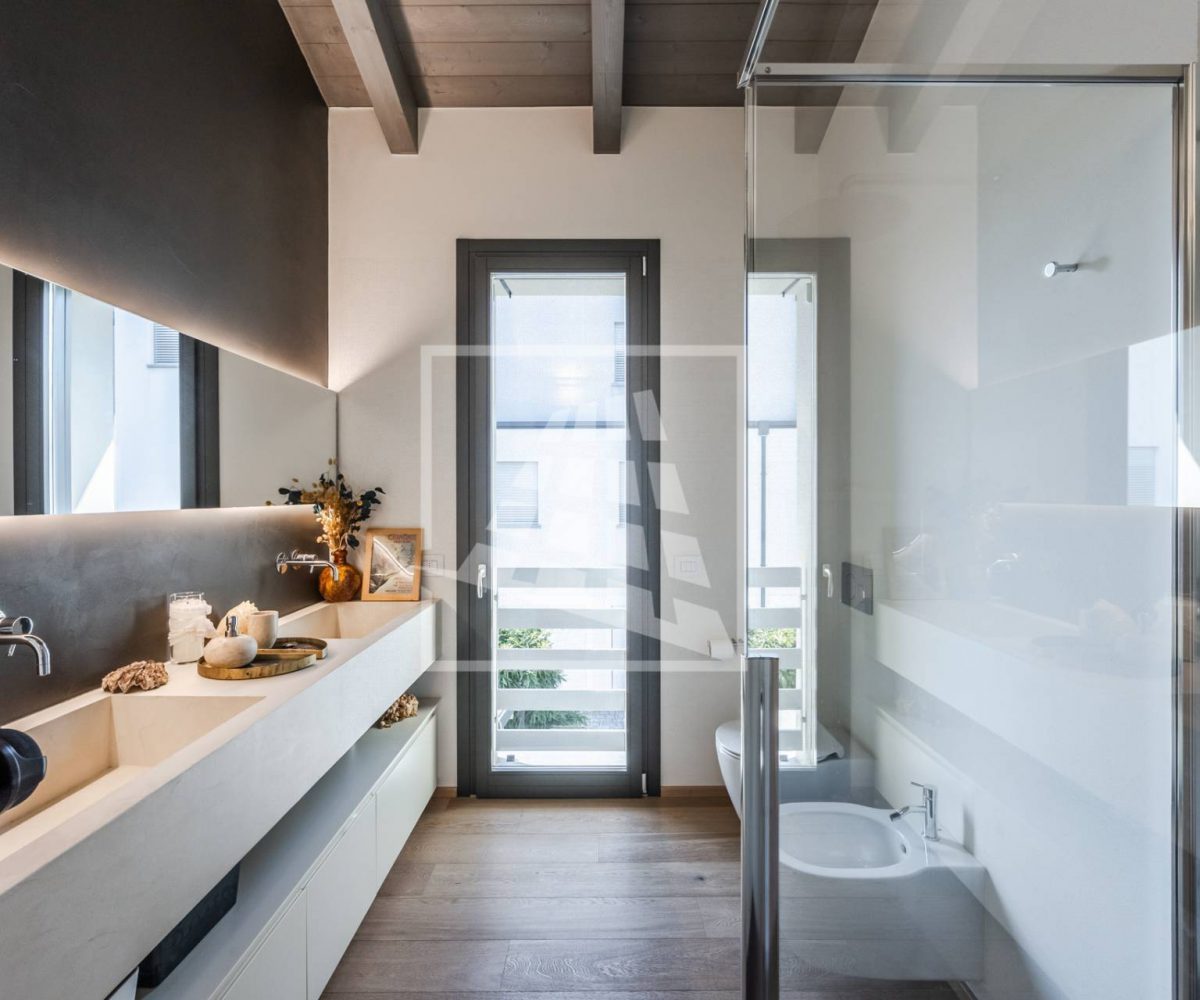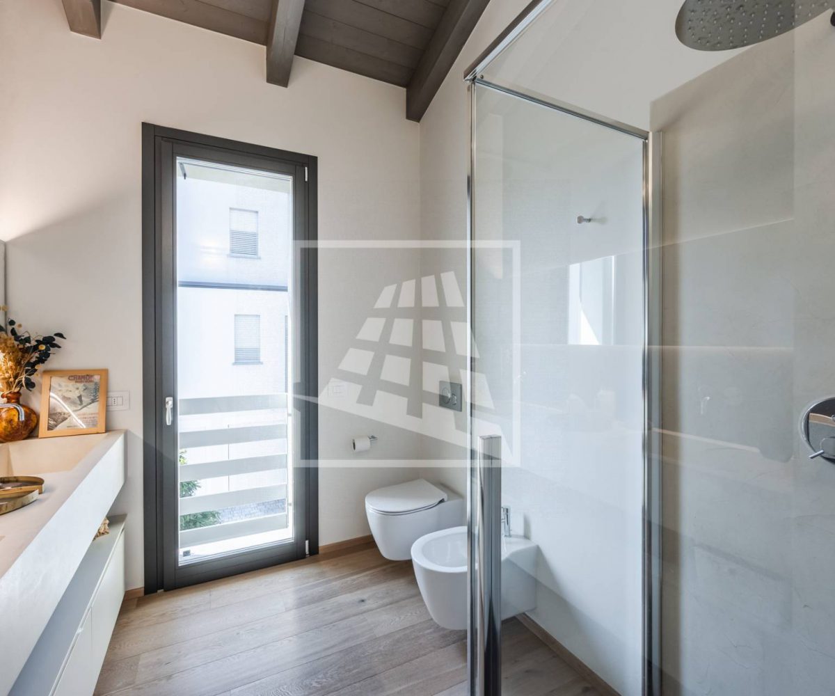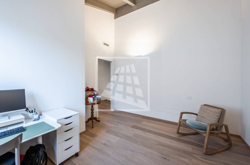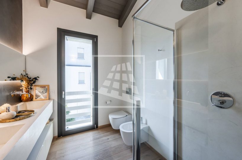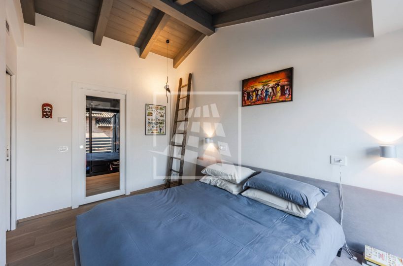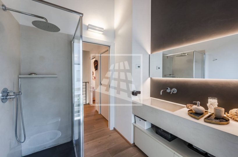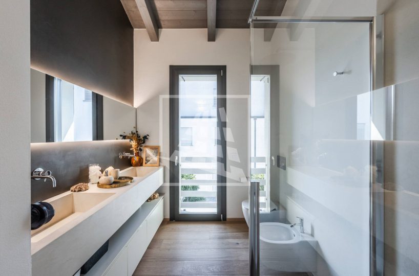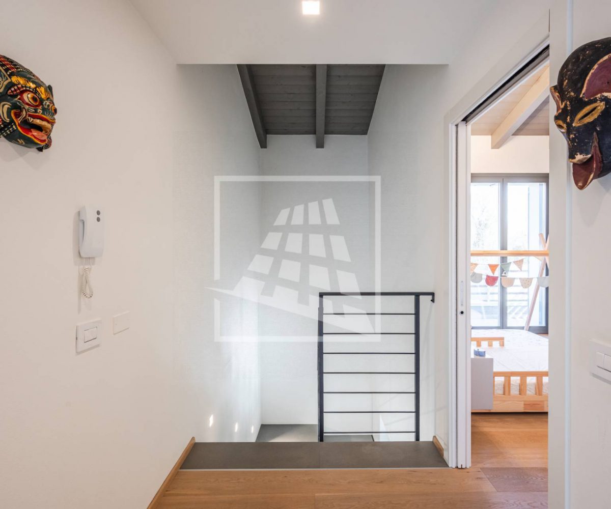 Attraverso un’elegante scala con parapetto in vetro, si raggiunge il primo piano interamente dedicato alla zona notte caratterizzata da tetto in legno ventilato con travi a vista e pavimenti in parquet.