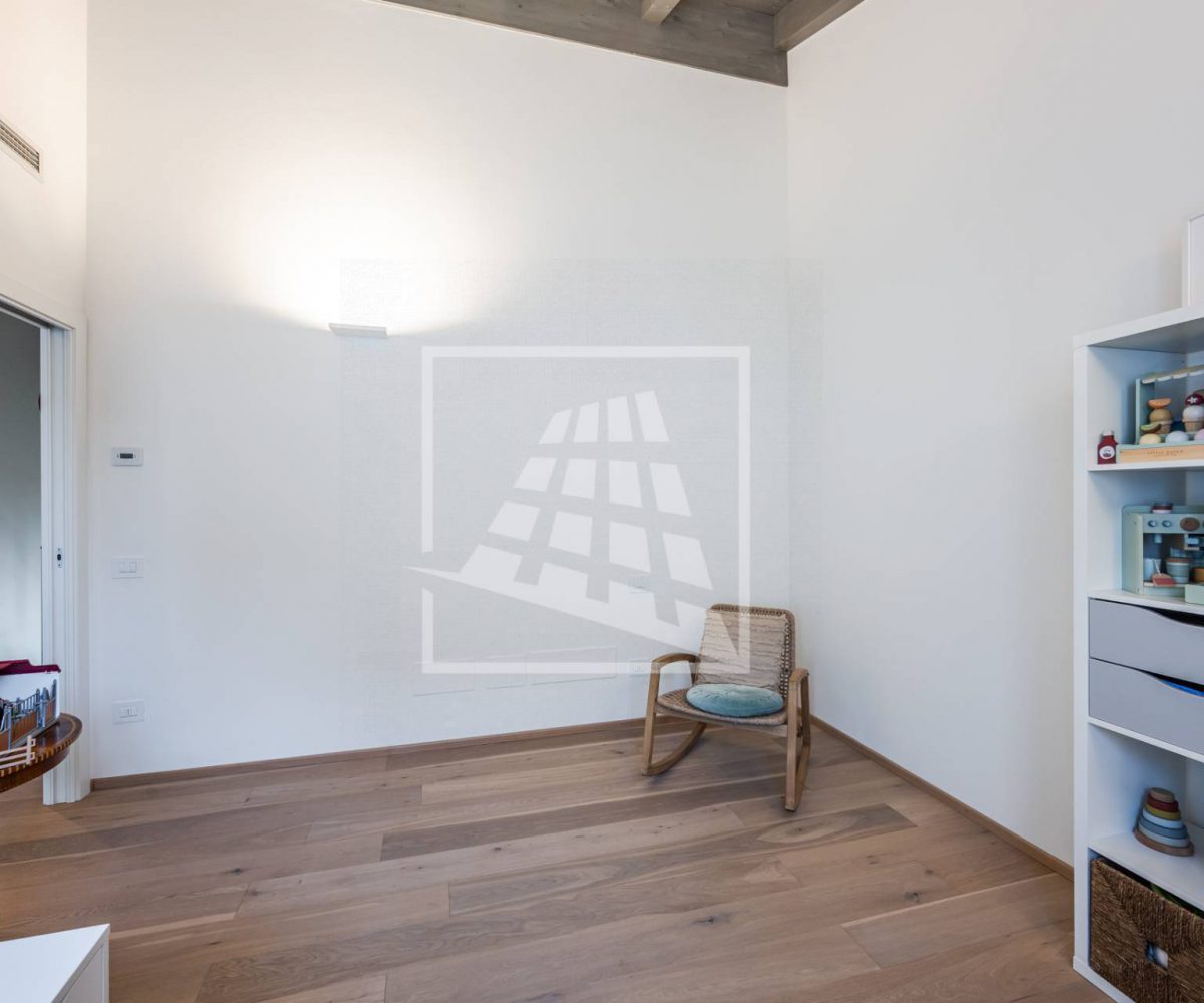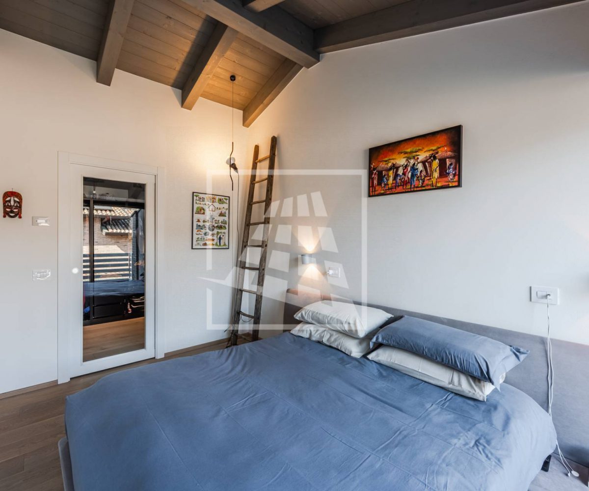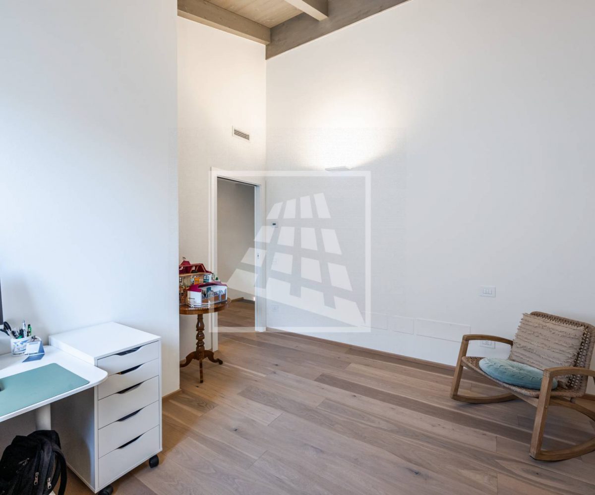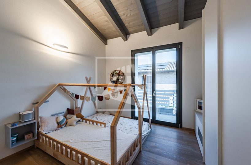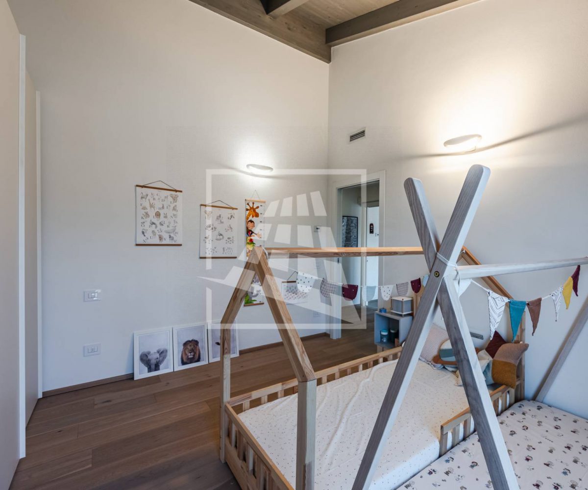 Attraverso un’elegante scala con parapetto in vetro, si raggiunge il primo piano interamente dedicato alla zona notte caratterizzata da tetto in legno ventilato con travi a vista e pavimenti in parquet.
