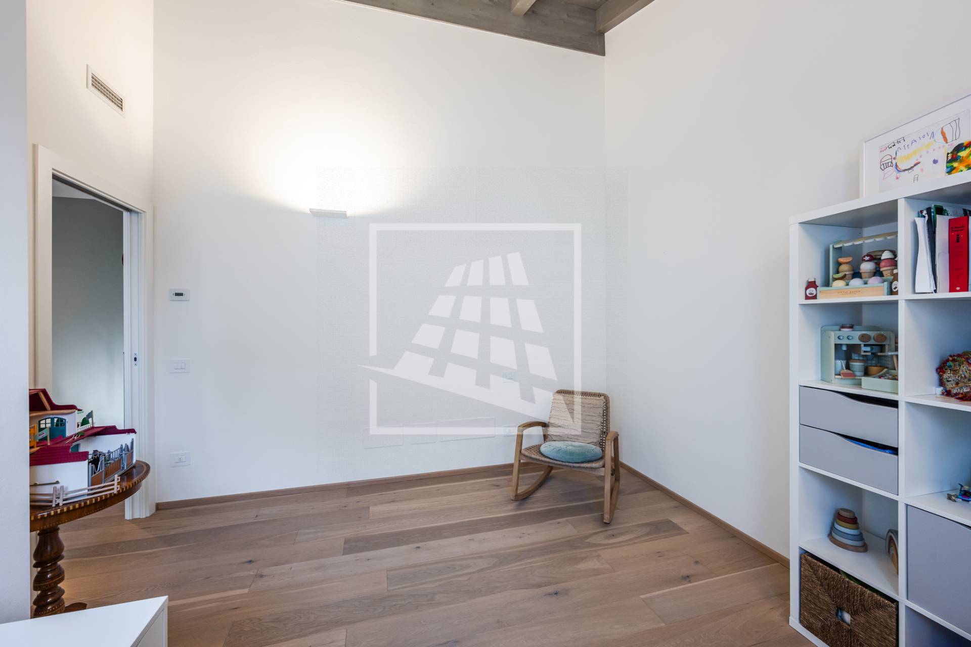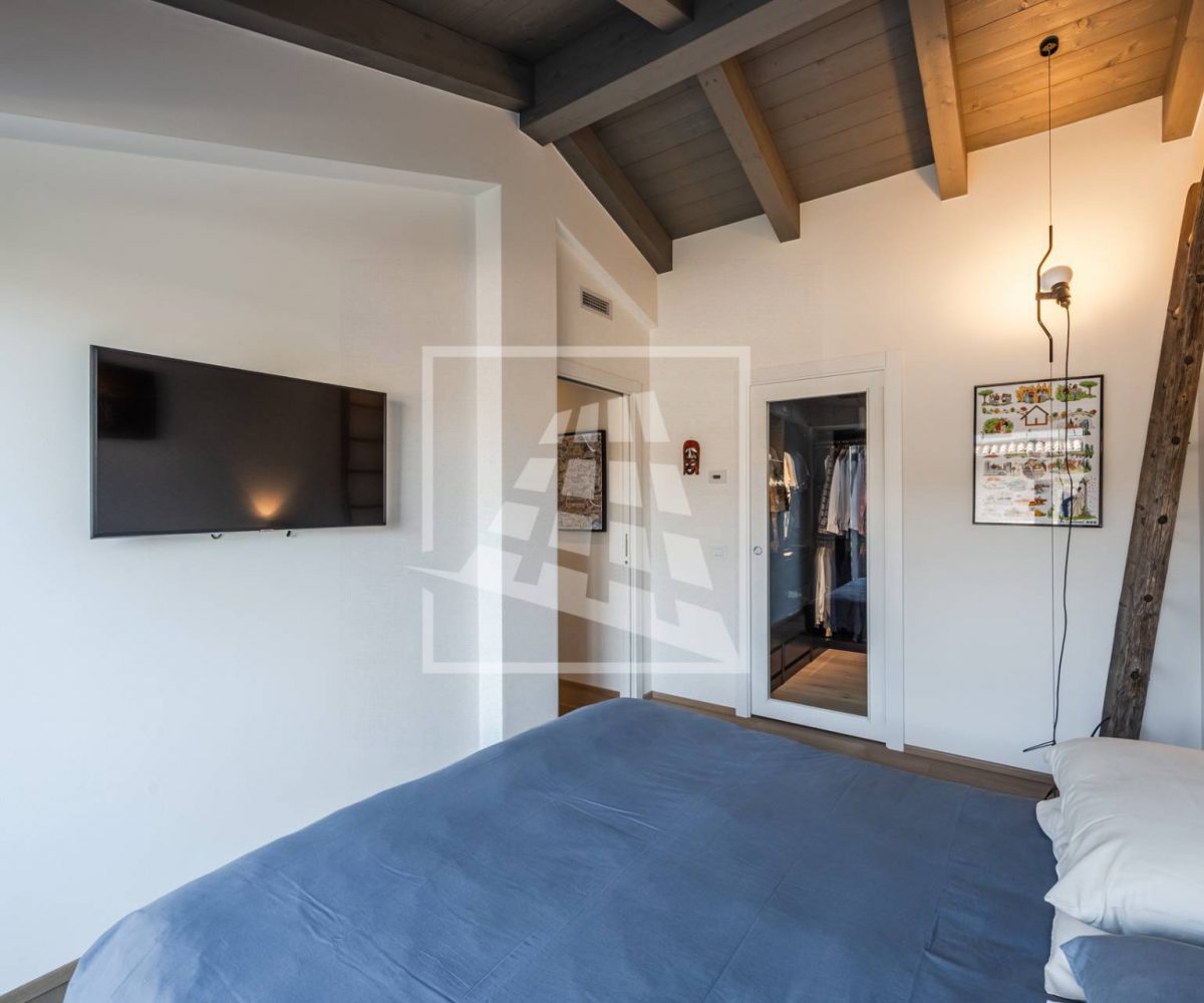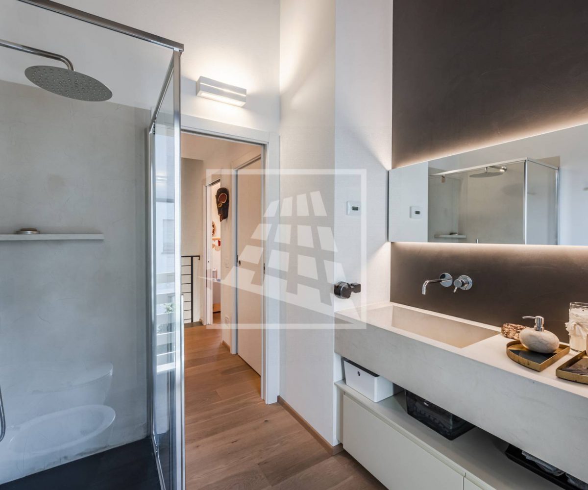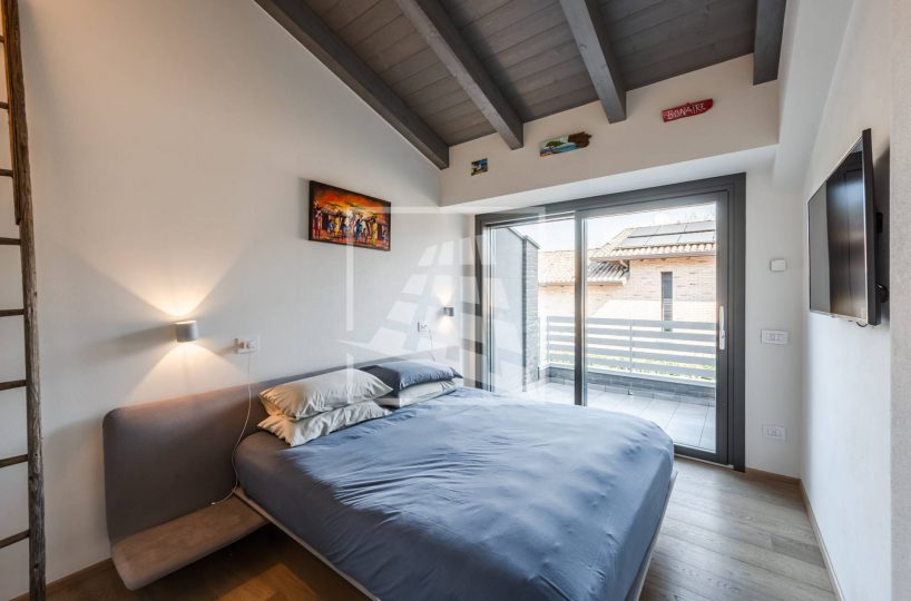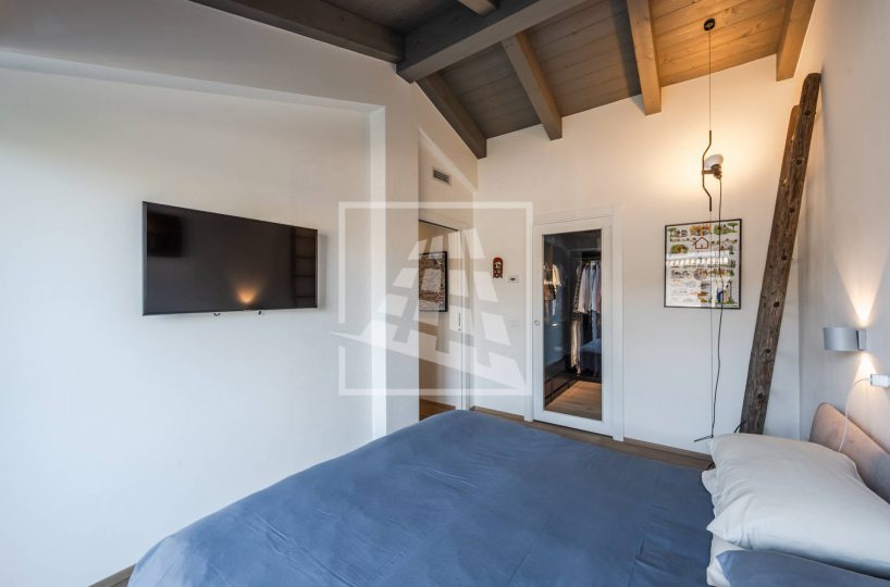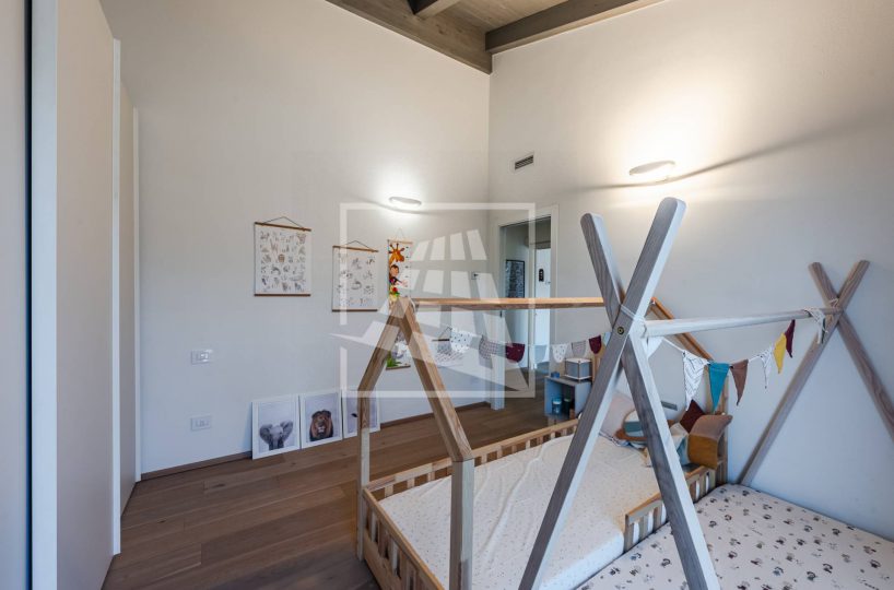 Attraverso un’elegante scala con parapetto in vetro, si raggiunge il primo piano interamente dedicato alla zona notte caratterizzata da tetto in legno ventilato con travi a vista e pavimenti in parquet.