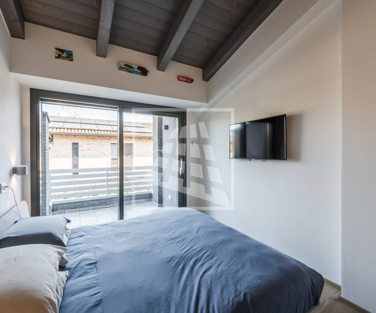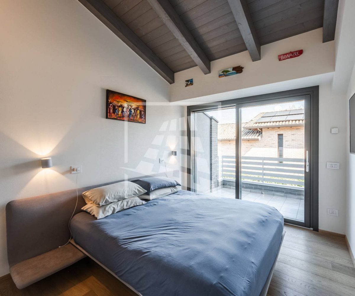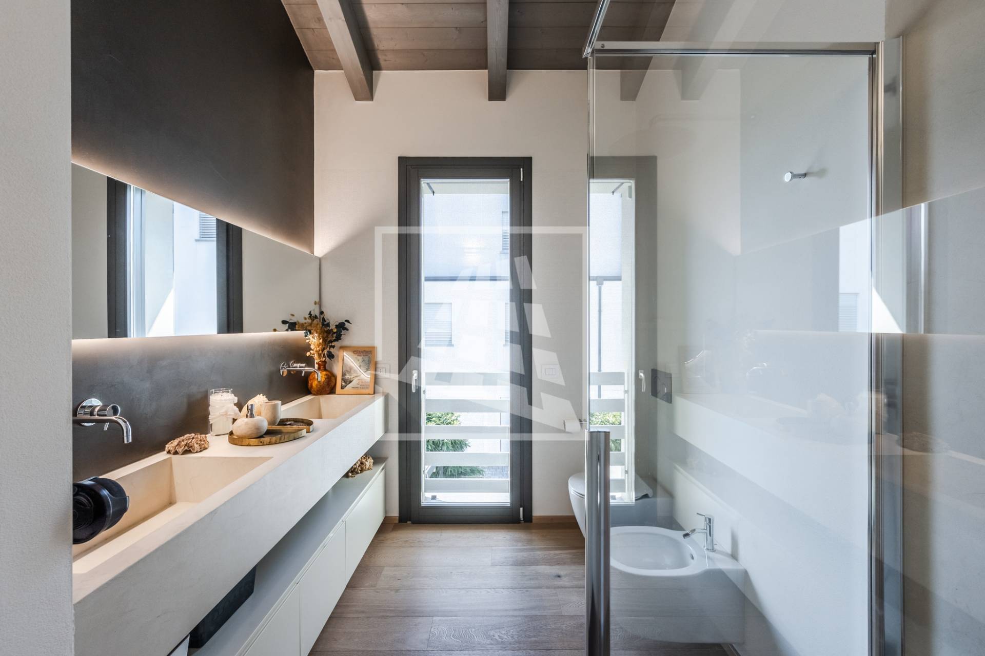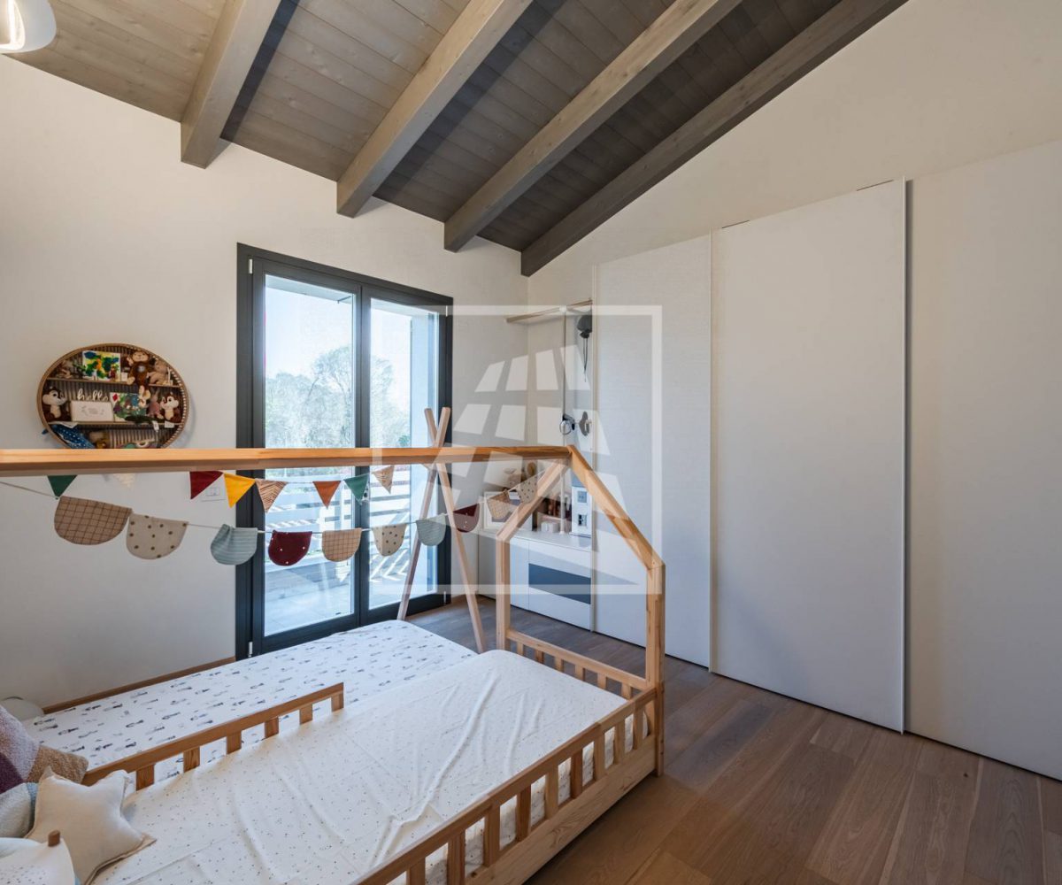 Attraverso un’elegante scala con parapetto in vetro, si raggiunge il primo piano interamente dedicato alla zona notte caratterizzata da tetto in legno ventilato con travi a vista e pavimenti in parquet.