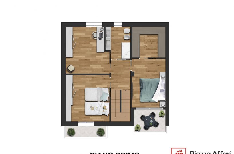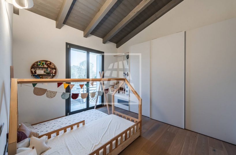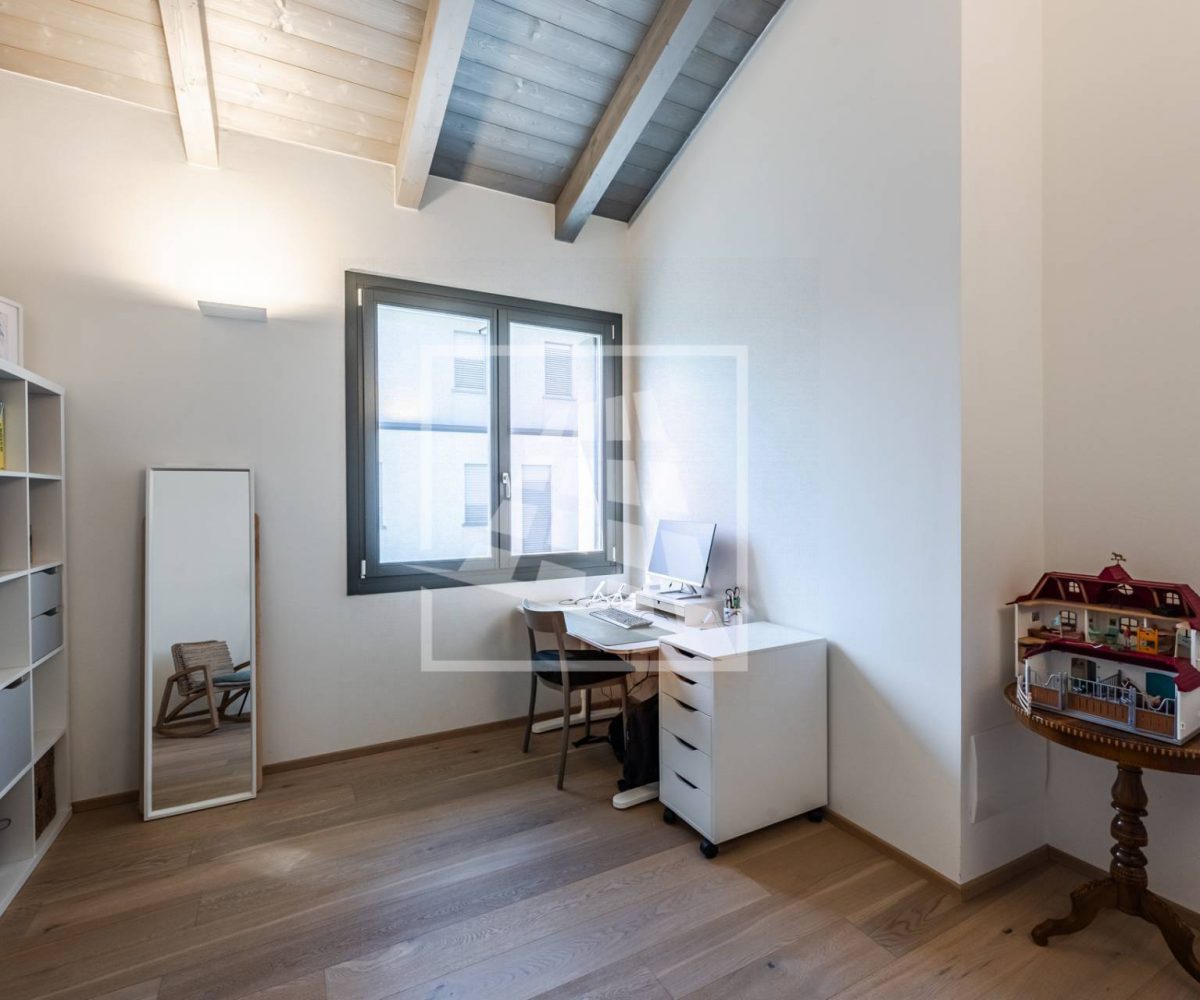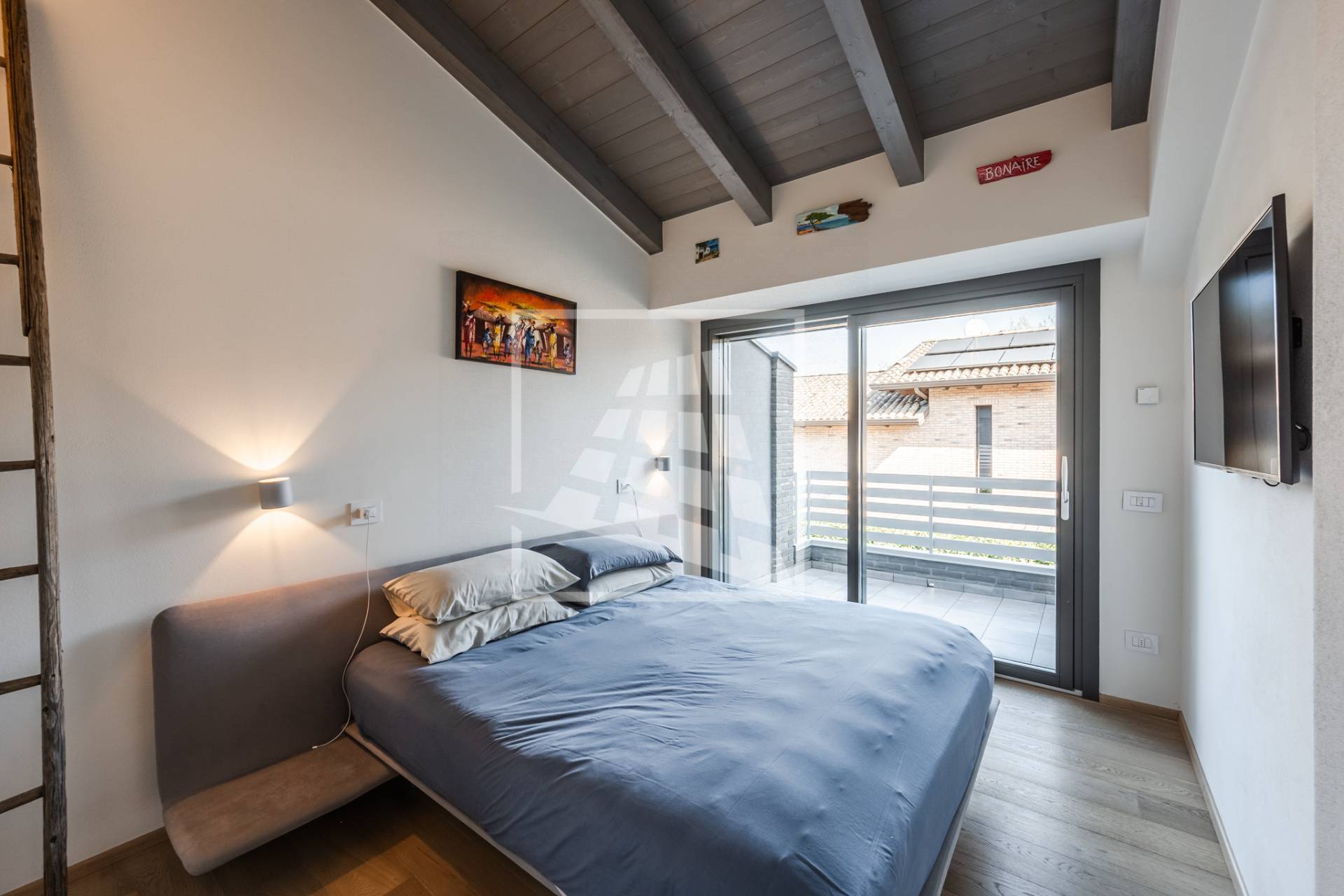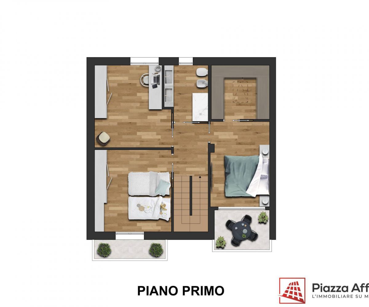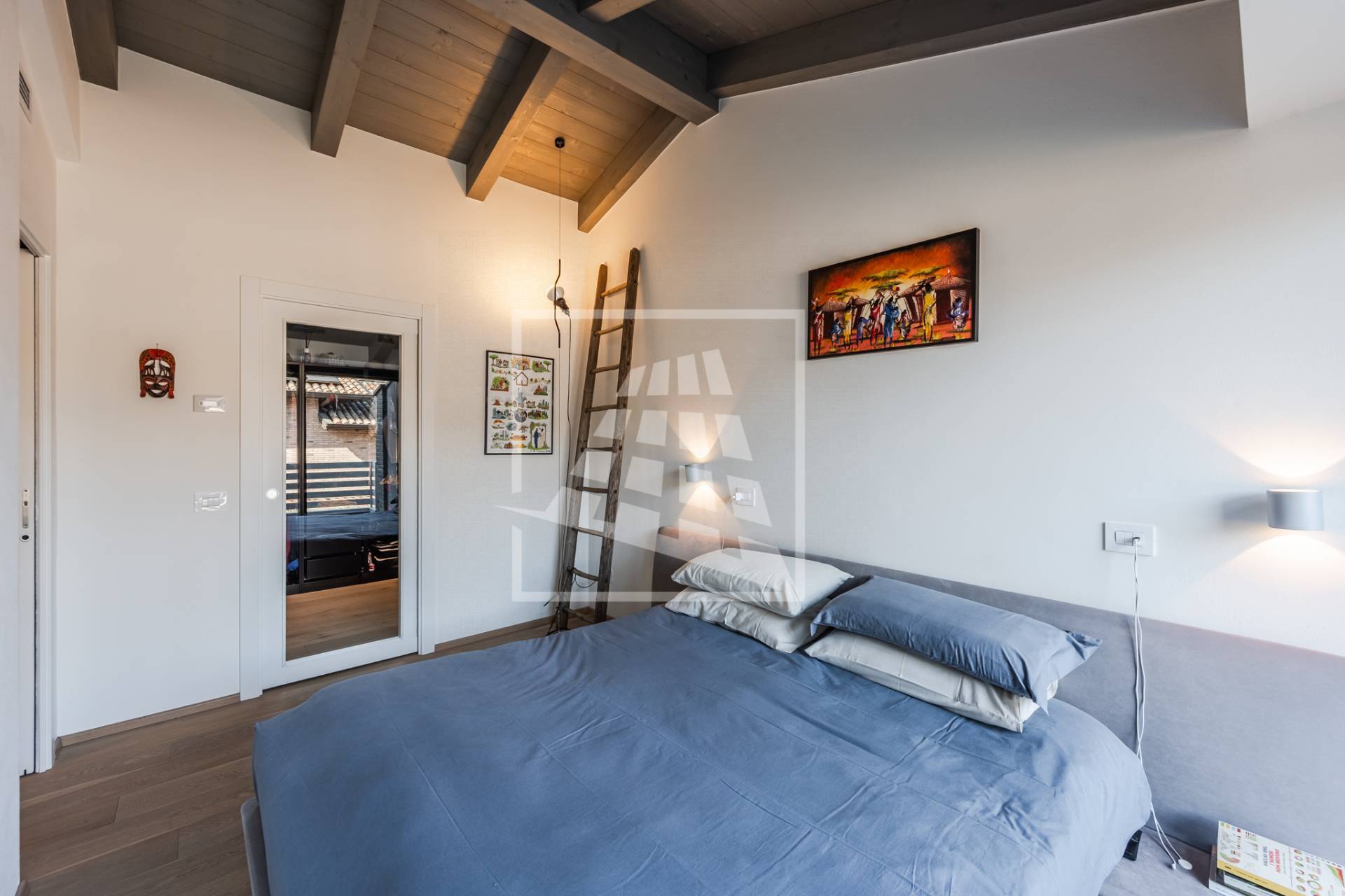 Attraverso un’elegante scala con parapetto in vetro, si raggiunge il primo piano interamente dedicato alla zona notte caratterizzata da tetto in legno ventilato con travi a vista e pavimenti in parquet.