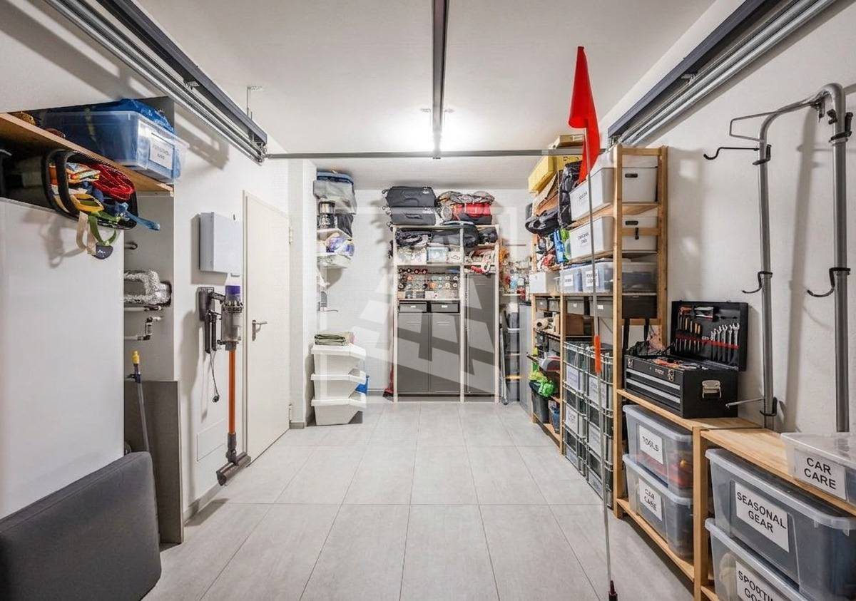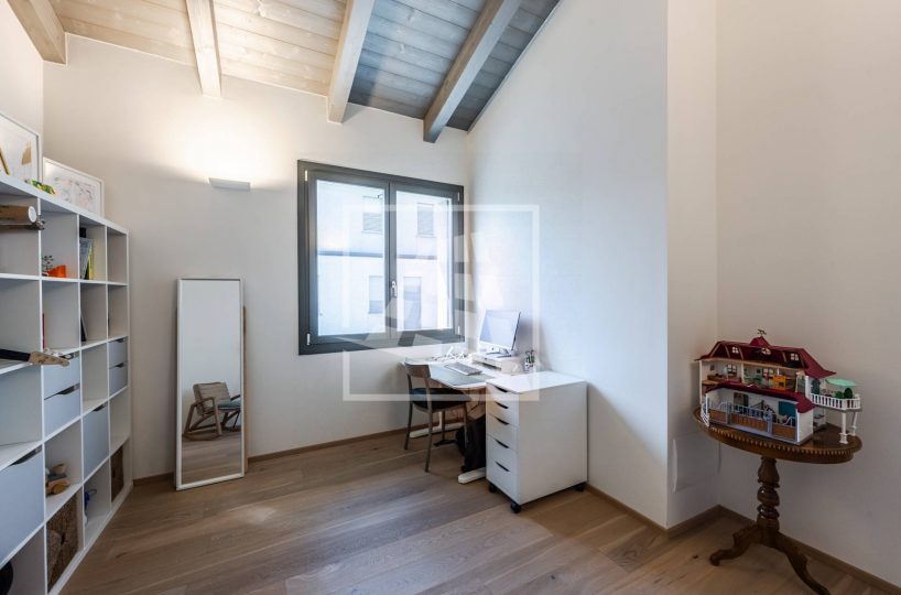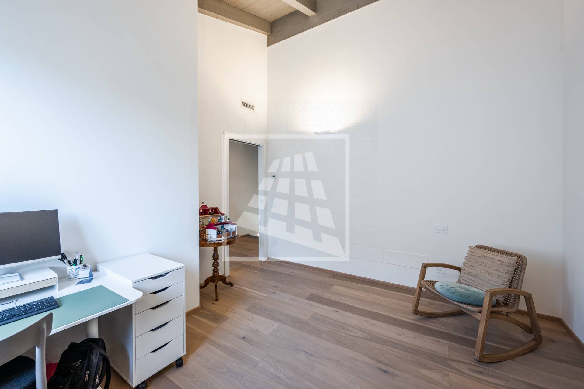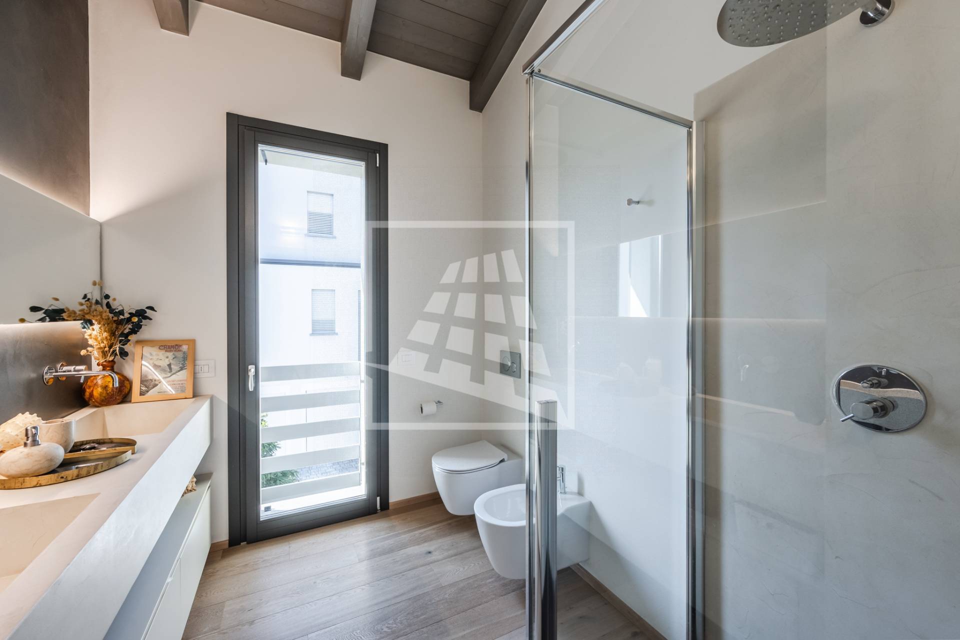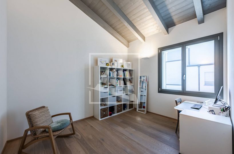 Il piano terra si completa con un pratico ripostiglio, un bagno finestrato con doccia e angolo lavanderia, oltre al collegamento diretto all’autorimessa dotata di bascula automatica.