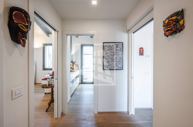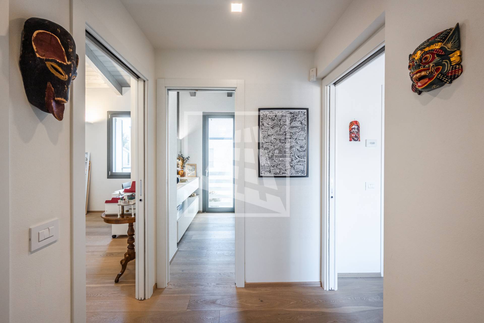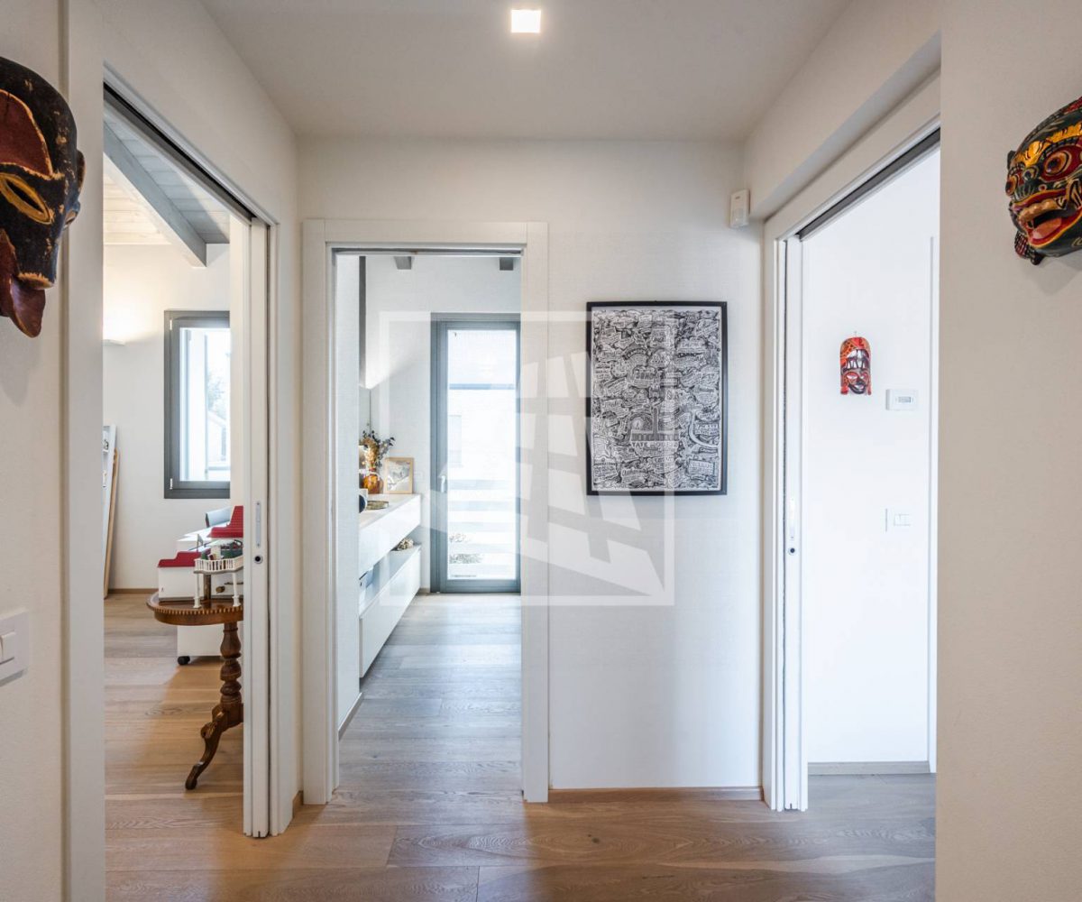 Dispone, inoltre, di finiture extracapitolato di alto livello, tra cui il cappotto termico, scuretti in alluminio e raffinate porte scorrevoli laccate.