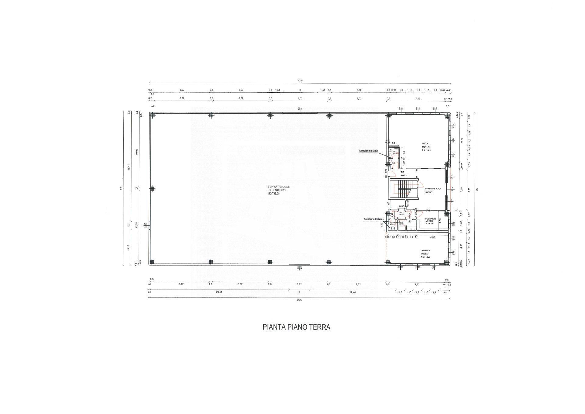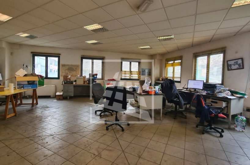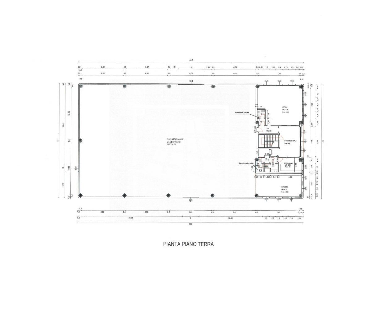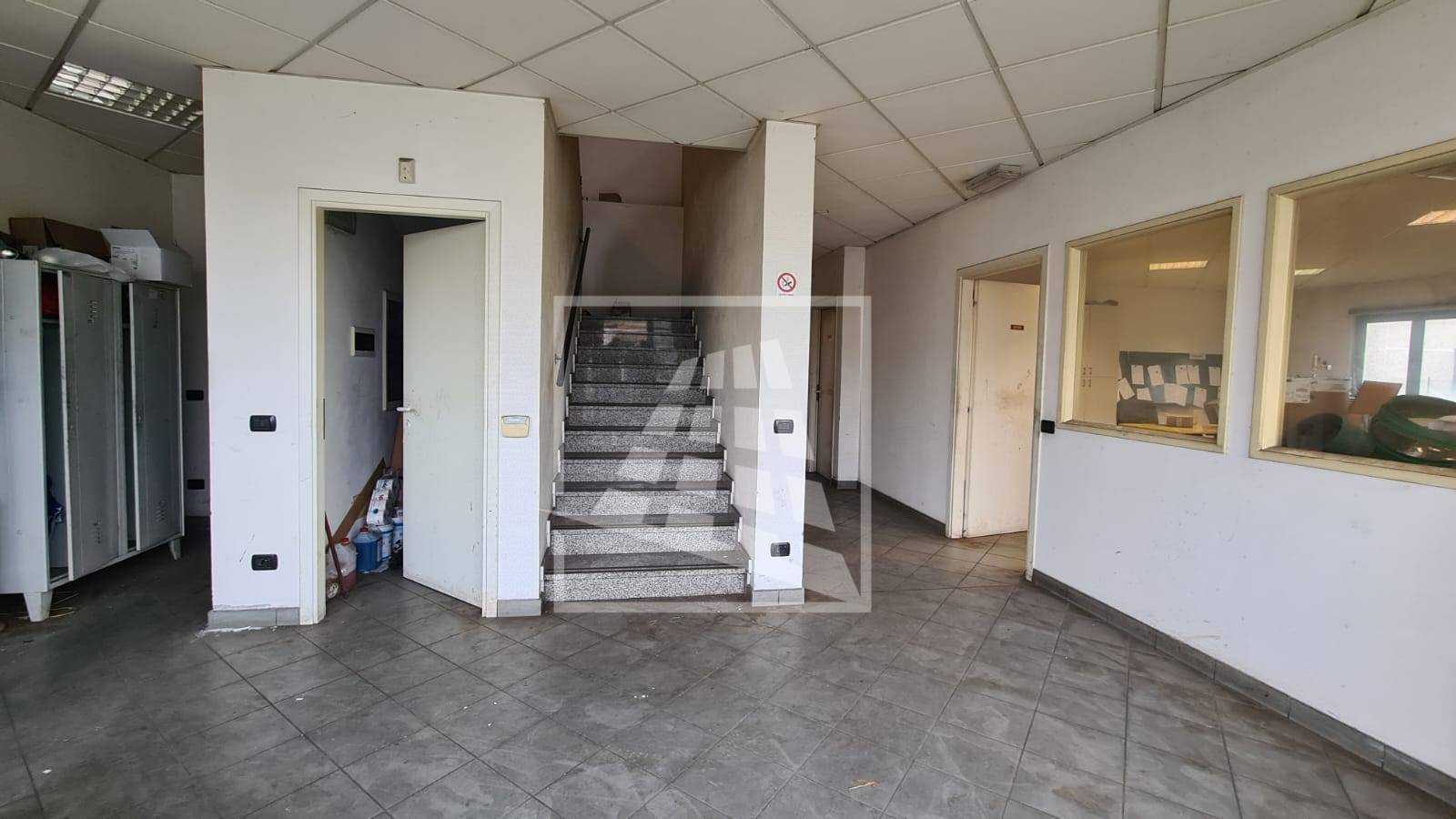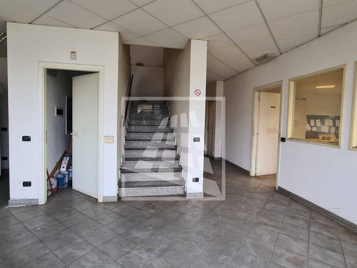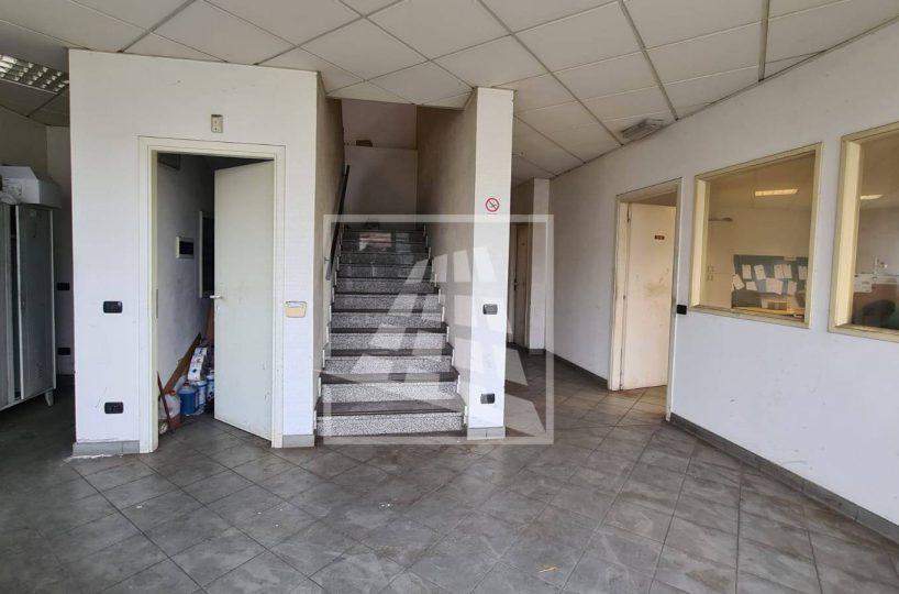 Al piano terra, per mq 160, un vano ingresso, ufficio open space con servizio, locale deposito e spogliatoio con servizio e doccia.